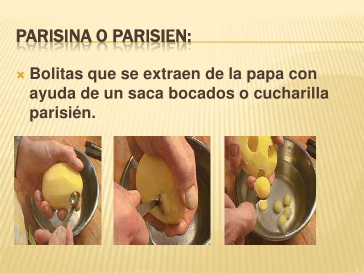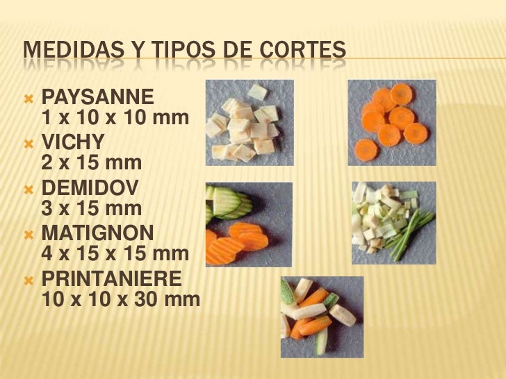 Aquí os dejo una fotografías que he encontrado en la red, en ellas explica fácilmente el tamaño de los cortes de patatas y verduras; sinceramente espero que os sirva de algo.